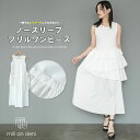 【17%OFFクーポン】ノースリフリルワンピース ななめフリル ノースリーブ ロング丈 クルーネック 異素材切替 ワンピース 白 無地 M きれいめ レディース 春 夏 秋 ミリアンデニ