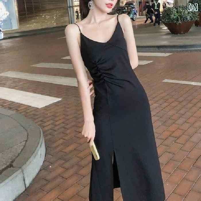 レディース キャミソールワンピース きれいめ 体型カバー マキシ丈 魅惑的 雰囲気の ギャルの 黒い ストラップの ワンピースの ロング スカートの 新型の 春夏の 外は 腰の 中を 収めて 底の スカートの 潮を 掛けます。
