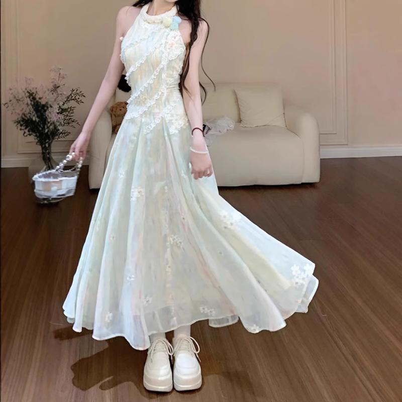 ・カテゴリ: ワンピース・スタイル: ホルターネック、スウィート、エレガント・主な素材: ポリエステル 70~80%、スパンデックス 30%以下・柄: 小花柄・加工: プリント・丈: ロング・スカートタイプ: Aライン・ネックライン: ラウンドネック・袖丈: ノースリーブ・ウエスト: ハイウエスト・デザイン要素: ペイント・カラー展開: シーフォームグリーン・サイズ展開: S、M、L・前立て: プルオーバー