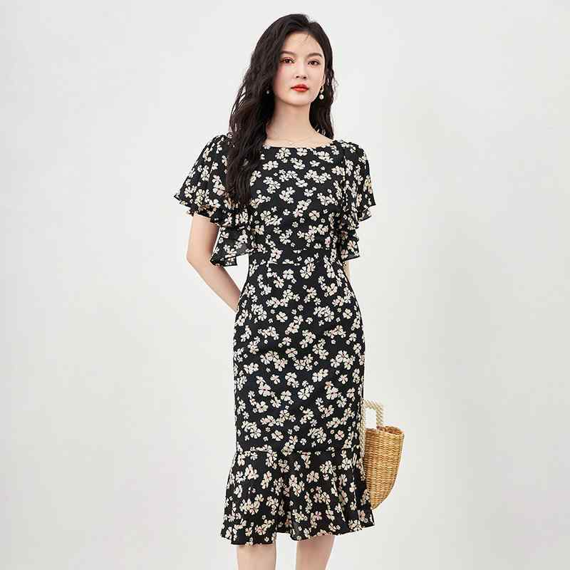 ワンピース レディース フレンチエレガント 上品シフォン 花柄 体型カバー ウエストマーク Aライン ミモレ丈 ラウンドネック フリル袖 半袖 春夏 ブラック ポリエステル