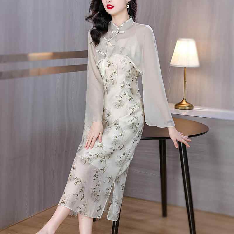 ワンピース レディース 春夏 レトロ エレガント 花柄 キャミソールワンピース 羽織り セットアップ 体型カバー スタンドカラー 飾りボタン ポリエステル ロング丈 長袖 きれいめ 通勤 お出かけ