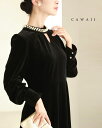 (S~M対応)(黒)ぐるりと囲むパールネックのベロア調ミディアムワンピース