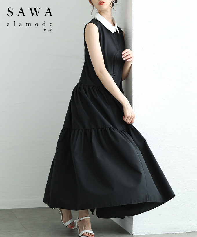 美しいドレープを描くバイカラーブロードティアードワンピース レディース ファッション ワンピース 黒 ブラック 春服 大人可愛い 40代 レディースファッション 50代女性 ファッション 60代 ミセスファッション サワアラモード sawaalamode otona 【4月23日20時販売新作】