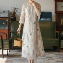 ワンピース レディース 春夏 綿麻 リネン 小花柄 Aライン ロング丈 七分袖 前開き ラウンドネック ゆったり 中国風 民族風 レトロ エスニック 盤扣