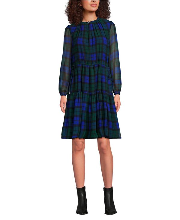 ランズエンド レディース トップス ワンピース シフォン Lands' End Women's Chiffon Above the Knee Adjustable Dress Cobalt blackwatch plaid コバルト