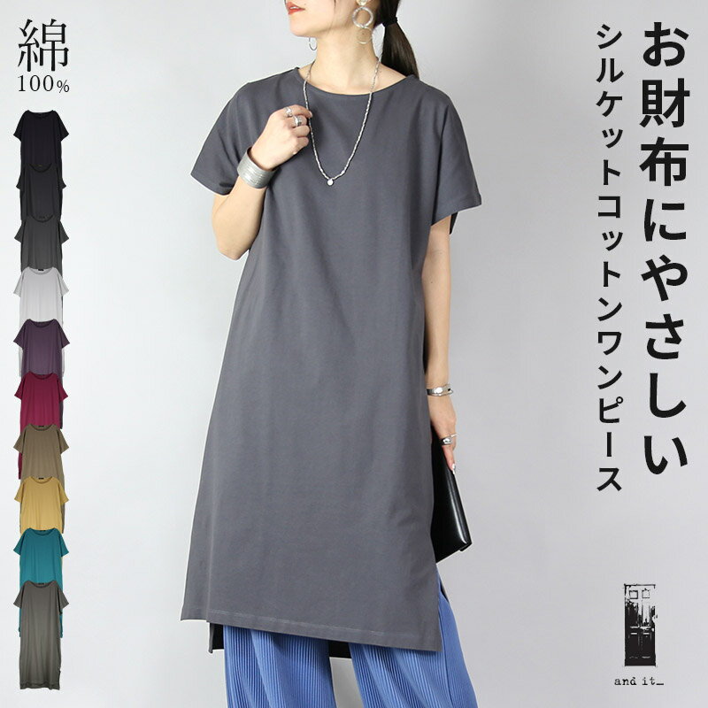 ワンピース レディース お財布にやさしい シルケットコットンサイドスリットカットワンピース コットン 綿100% 半袖 春 夏 ブラック ネイビー チャコール スモーキーグレー パープル ワイン モカ キャメル ダークグリーン スモーキーカーキ M L XL メール便10