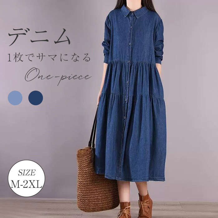 ワンピース デニム 春 きれいめ シャツワンピース 長袖 大人 ロングワンピース マキシワンピース 膝下丈 ゆったり 体型カバー 着痩せ カジュアル シンプル ロング丈 お洒落 無地 20代 30代 40代 50代 60代 ダークブルー ライトブルー M L XL 2XL