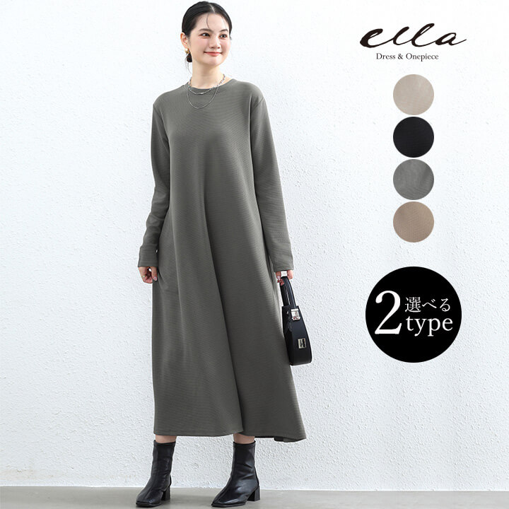 ワンピース マキシ丈 マキシ丈ワンピ ロングワンピース ロング丈 ロングワンピ レディース 女性 長袖 半袖 袖あり クルーネック シンプル エンボス生地 エンボス カジュアル ゆったり 二の腕カバー フレア 無地 ベージュ ブラック ダークグレー モカ 黒 灰色 茶色 rt0198