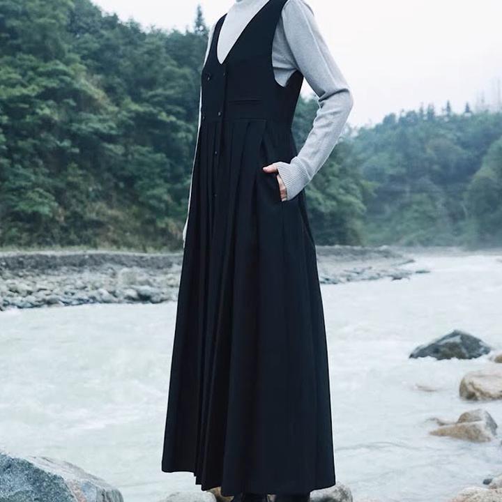 ダーク プリーツ ベスト V ネックドレス オール レトロ スカート 韓国 ジャンパースカート コーデ 秋 冬 大人 大きいサイズ vネック レディース 黒 スカート フレア ロングワンピース オールインワン 低身長 ツイード きれいめ エレガント かわいい カジュアル ロング丈