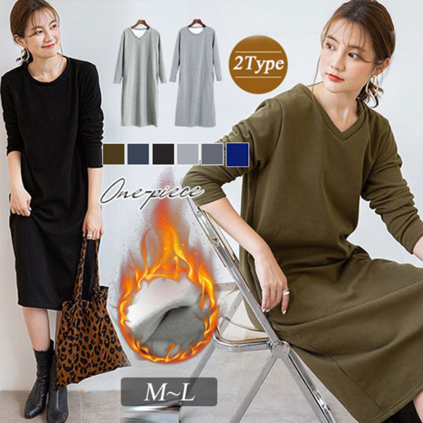 レディース ワンピース Tシャツワンピース 防寒 裏起毛 レジャー レディー 女性 成人 長袖 ワンピ 無地 冬服 丸首 Vネックワンピー 無地 M L 冬着 外出 通勤 レディー ワンピー 暖かい ブラック ネイビー グレー グレージュ グリーン ダークブルー ファッション