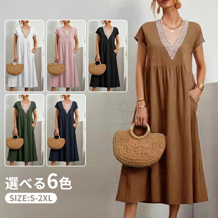 半袖 ワンピース レディース ロングワンピース リネン 綿麻 マキシ丈ワンピース シャツワンピ コットンワンピース ロング 夏 ワンピ 大人 綿 麻 女性用 vネック 通勤 通学 ホワイト ピンク ブラック オリーブ ブラウン ダークブルー S/M/L/XL/2XL