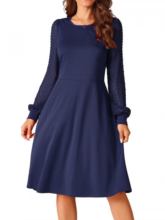 Seta T レディース 長袖 スイスドット ラウンドネック 膝丈 カジュアルドレス ポケット付き ダークブルー S