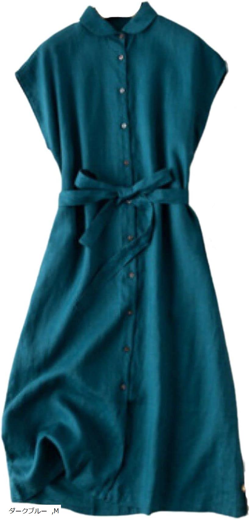 リネンワンピース レディース フレンチスリーブ かわいい シャツ(ダークブルー, M)