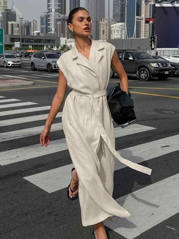 ワンピース レディース 秋 Aライン 無袖 膝下丈 綿麻 カ channel カーキ色 スーツ襟 ウエストリボン 7分袖 通勤 オフィス きれいめ 上品