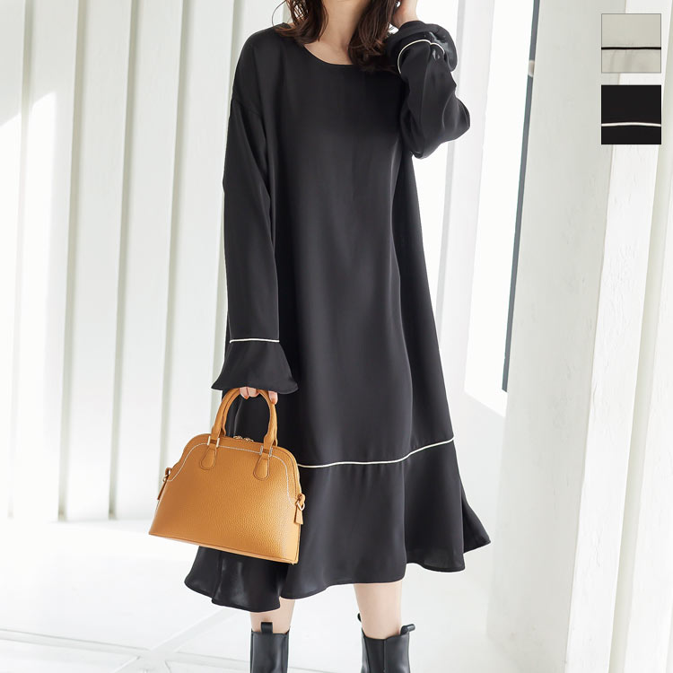 ≪ 特別セール ≫送料無料! パイピングワンピース [E2973] レディース ワンピ 長袖 ロング丈 フェミニン カジュアル きれいめ ゆったり リラックス ロングワンピース パイピング 体型カバー 秋冬 黒 大人 フリル 無地 上品【送料無料】