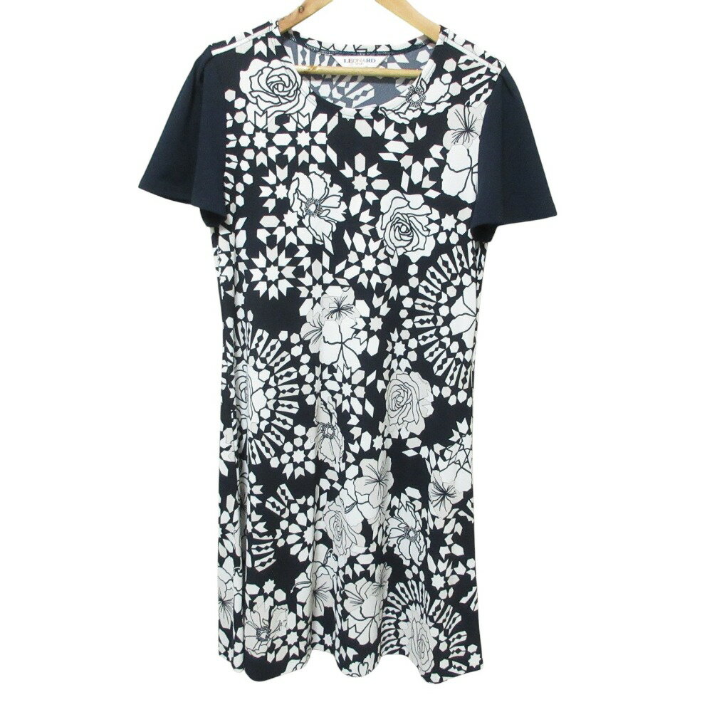 【中古】良品 LEONARD SPORT レオナールスポーツ フラワープリント 半袖 膝丈 ワンピース 38 ネイビー レディース Luxs ブランド古着のリュクス