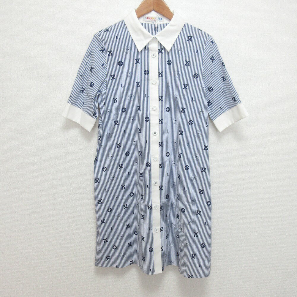 【中古】良品 LEONARD SPORT レオナールスポーツ ロゴプリント ストライプ シャツワンピース サイズ40 ブルー レディース Luxs ブランド古着のリュクス