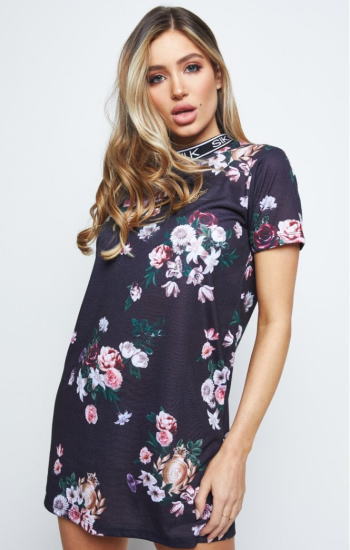 SikSilk シックシルク ワンピース Tシャツ レディース半袖Tシャツ 黒 ブラック ミニワンピース 花柄お花 ミニスカート ショート丈 スポーツウエア ロゴ Tシャツワンピ柄ワンピ カジュアル スポーツウエアプリステージ フローラル Tシャツドレス【Mサイズ】