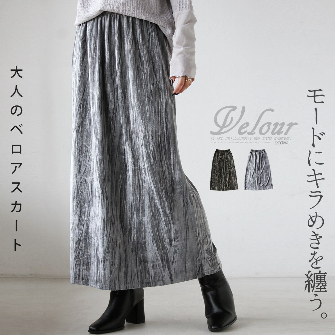 スカート モードにキラめきを纏う 大人のベロアスカート 箔 ストライプ ロング スリット ウエストゴム 着映え 着回し 光沢感 マット ブラック グレー 春 秋 秋冬 10/4[0.5]