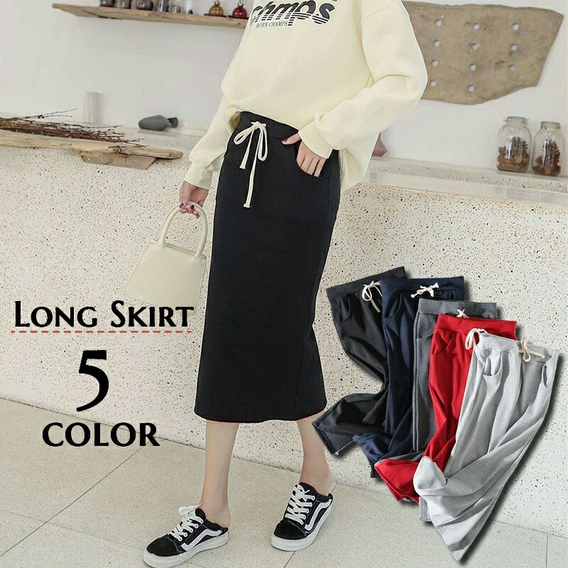 送料無料 ロングスカート レディース ボトムス 無地 紐 ウエストゴム スリット入り ポケット タイトスカート おしゃれ 可愛い カジュアル シンプル お出かけ 着回し デイリー 旅行 通勤 通学 女の子 女性用 婦人服 黒 ネイビー グレー 赤