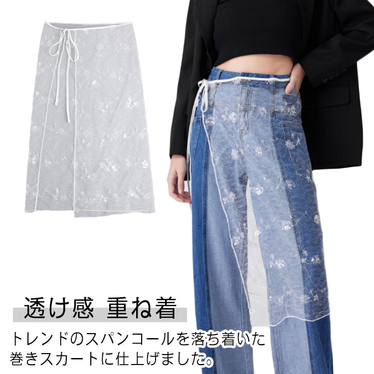 シースルー 膝上 レーススカート チュール 巻きスカート 透け感 コーデ チュール 透け ズボンの上 シアー レディース ラップスカート 総レース 総レース ボトムス 春 チューリップ柄 リボン柄 刺繍 雪柄 お洒落 ふんわり 重ね着 ゆったり レイヤード