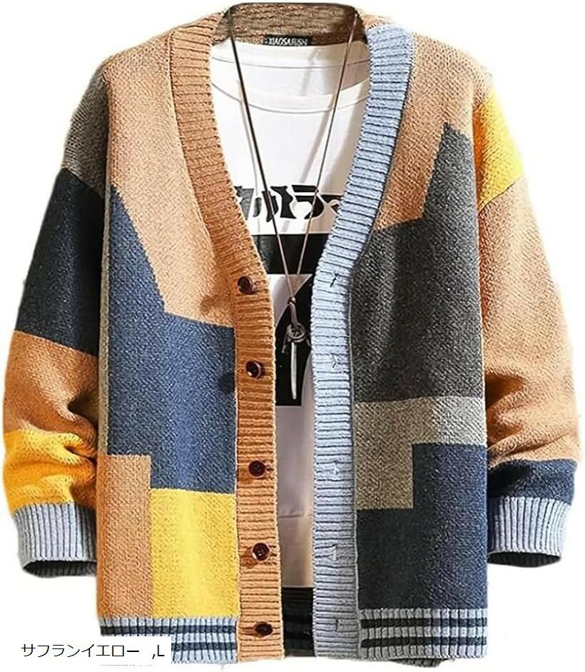 エンプティオ ボタン ニット アメカジ 前開き 暖かい カラフル カーディガン メンズ カワイイ ザックリ ベーシック せーたー 部屋着 エスニック アッタカ モコモコ ニットセーター (サフランイエロー, L)