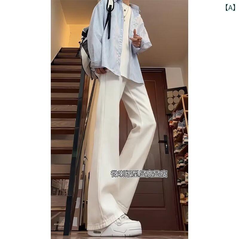 パンツ メンズ アイボリー ドレープ感 とろみ素材 接触冷感 細見え スタイルアップ 脚長効果 微フレア ストレート ルーズフィット フルレングス カジュアル スラックス ボトムス ポリエステル混紡 ストレッチ ミドルウエスト アメリカンレトロ 春夏秋