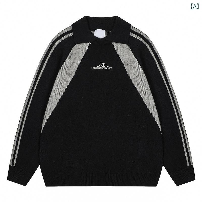 セーター メンズ 男性用 カップル ペアルック 学生 若者 秋冬 アメリカンレトロ アメカジ 襟付き ポロ襟 ゆったり ルーズフィット ビッグシルエット ドロップショルダー リラックス感 スタイルアップ 着痩せ ストリートカジュアル ジャガード編み アク