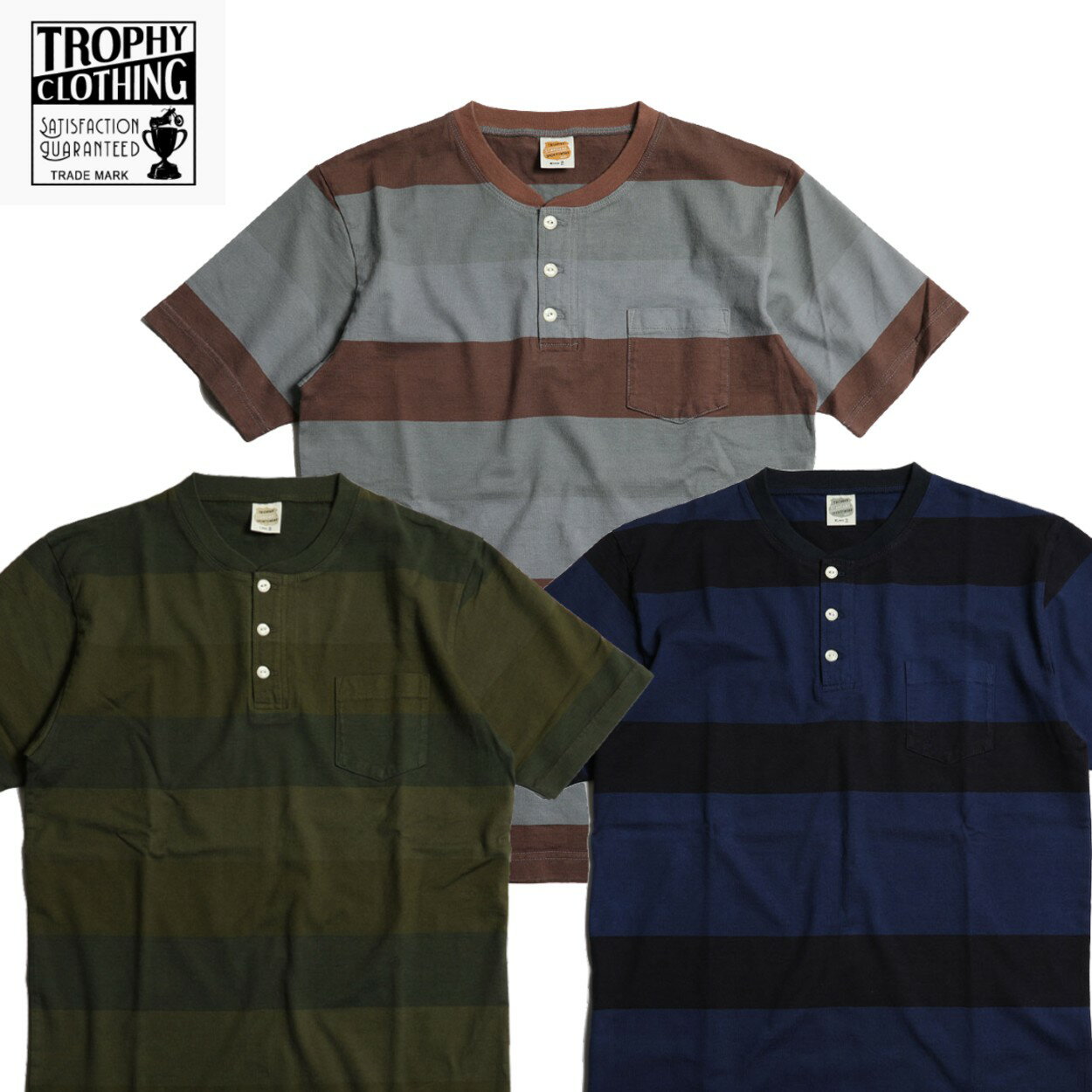 TROPHY CLOTHING / "OD 3 Color Henley Wide Border S/S Tee" 後染め加工された幅を3インチに設定した3配色ワイドボーダーTシャツ。 ポケットは柄合わせ、裾にブランドロゴを転写プリントで施しています。 3色共に他に類を見ないオリジナリティある配色とオリジナルで製作された生地。 ミディアムオンスのコットンコーマ天竺は柔らかく肌触りの良さが特徴です。 ヘンリーネックは一枚での着用はもちろん、ワークシャツやデニムジャケットのインナーにお薦めです。 オリジナル生地は、30番手/2双糸のコーマ糸を使用し、オリジナルで編み立てた3インチワイドボーダー。 紡績工程で「コーミング」という工程を経て短いワタを取り除いています。 この工程を通した綿糸は、毛羽が少なく、生地に柔らかさと光沢感のある 上質な仕上がりとなります。 コットンの原料には良質な中長綿のインド綿を採用しています。 「ロンフレッシュ」 天然由来の原料から生成された抗菌剤を特殊な方法で繊維に結合させ、臭いの原因となる繊維上の常在菌が繁殖するのを抑制します。