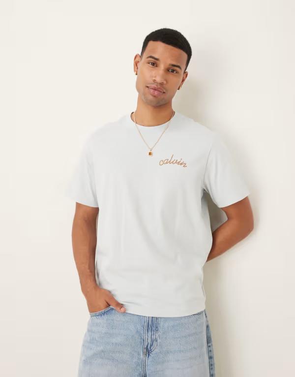 カルバンクライン メンズ トップス Tシャツ 刺繍 ロゴ Calvin Klein Jeans embroidered chest logo T-shirt in pale Glacier Lake ブルー
