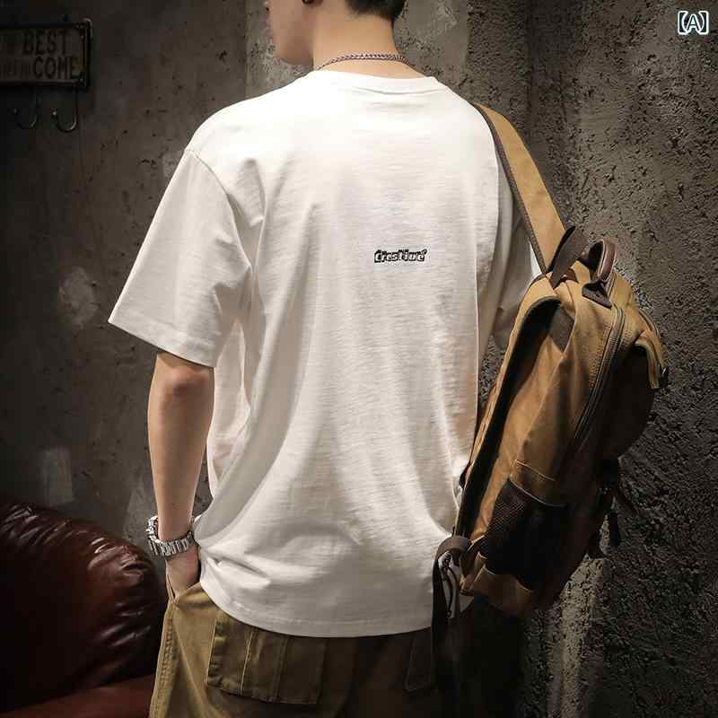 Tシャツ メンズ ストリート アメリカン カジュアルスタイル 半袖 クルーネック アルファベットプリント トップス ゆったり ルーズフィット 綿 コットン 通気性 春夏 ブラック ホワイト