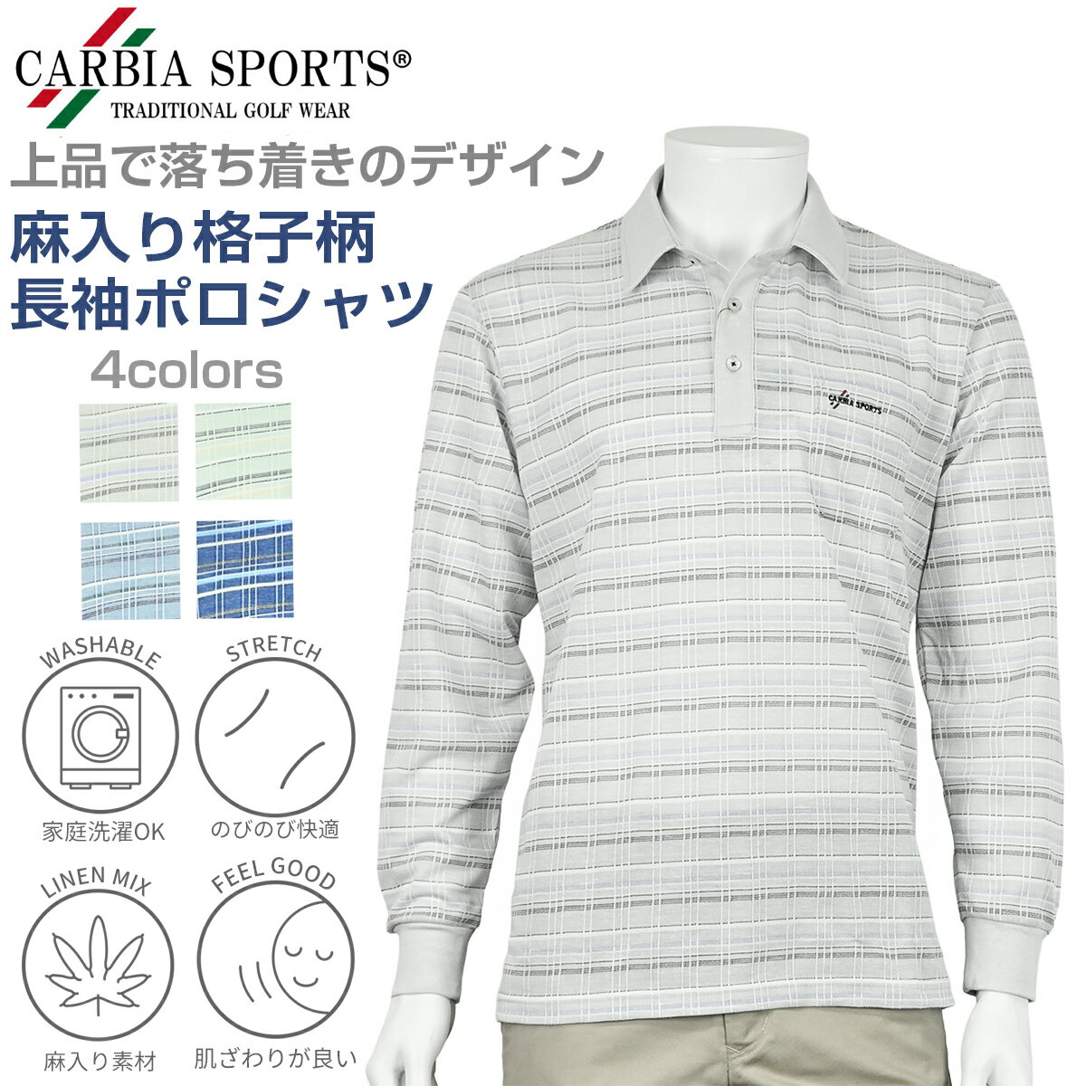 紳士 長袖 麻入り 格子柄 鹿の子 ポロシャツ CARBIA SPORTS カルビアスポーツ
