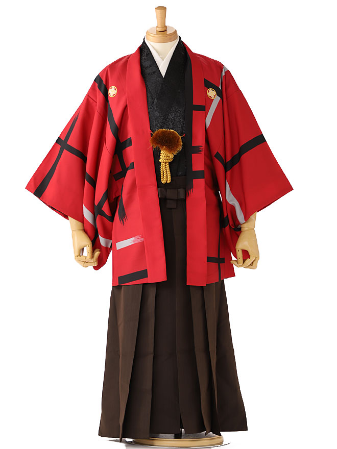 【ベーシック男袴】小さめ【成人式 袴 レンタル 男 卒業式 袴 レンタル 男【メンズ】【20歳】【成人式】【紋付】【羽織着物】【キュプラ×金属糸】赤【145cm-150cm】XS 往復送料無料 XG0168【レンタル】
