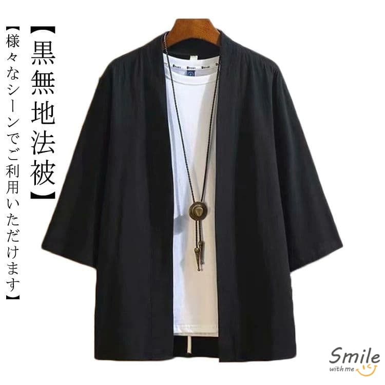 商品情報 サイズ 身丈:82cm身巾:64cm袖巾:36cm袖丈:50cm袖口:22cm衿巾:6cm 対象サイズ 身長:155〜190cm 素材 ポリエステル100% 生地 綾織 色 ブラック 黒 柄 無地 特徴 角袖・身八つ口 ・商品画像の光加減・web環境等により、色味の誤差・イメージ違い等、ご了承くださいますようお願い申し上げます。 ・クリーニング店での水洗いをお勧めします。 ・色落ち等の原因になります為、蛍光増白剤の入っていない洗剤をご使用下さい。 ・長時間の水への浸漬はお避け下さい。 ・洗濯により、加工部分のほつれが助長されることがありますので、ご了承下さい。シンプルでスタイリッシュな「羽織(はおり)」の登場です。 イベントからタウンユースまで 幅広いシーンでご利用いただけます。 和を演出する[角袖(かくそで)]仕立て ゆったりとした着心地と 袂のある「角袖(かくそで)」で 和のスタイルをお楽しみいただけます。 袖付は通気性を考慮し[身八つ口]仕立て 動きやすさの向上と、熱がこもらないよう通気性を出す為に 「身八つ口」を採用しています。 シンプルなデザインなのでコーディネートしやすく ユニセックスでご着用いただけます。 柔らかく肌触りの良い[綾織(あやおり)]生地 動綿の風合と軽さを兼ね備えた 弊社オリジナルのポリエステル生地です。 綾織特有の斜文(斜めの織り目)が特徴。 平織生地とは異なり、柔らかく肌触りが良いので 着心地も軽やかです。 2