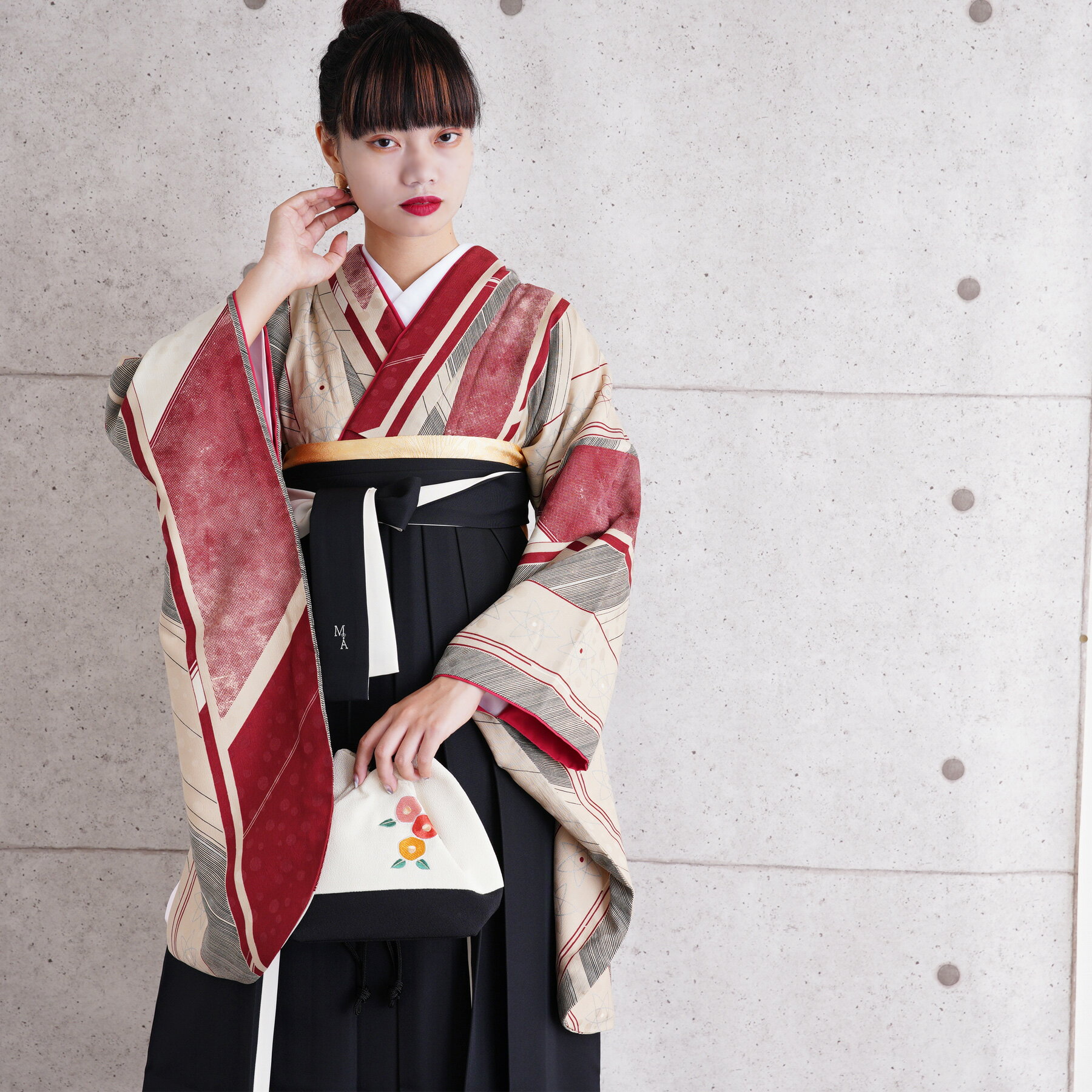 【レンタル】【モダンアンテナ 袴 17点セット 日本製 ベージュにえんじの矢絣と星】二尺袖着物 はかま フルセット 卒業式 大学生 専門学生 レディース 女性 袴91-99cm(身長153-170cm)足袋プレゼント 重ね衿縫い付済 往復送料無料