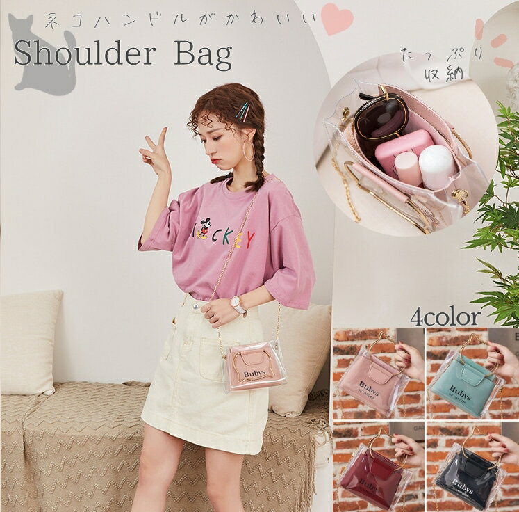 送料無料 ショルダーバッグ バッグ カバン ハンドバッグ 斜めがけ 手提げ 2WAY チェーンストラップ 透明 クリア 持ち手ネコ お出かけ おしゃれ かわいい 夏 レディース 女性