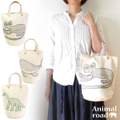 トートバッグ コットン 本革 レディース 猫 恐竜 クジラ ネコ 刺繍 ハンドメイド バケツ形 帆布 トートバック 縦長 カバン 動物 ねこ メンズ 鯨 ホエール 【Animal road】TTB-1001