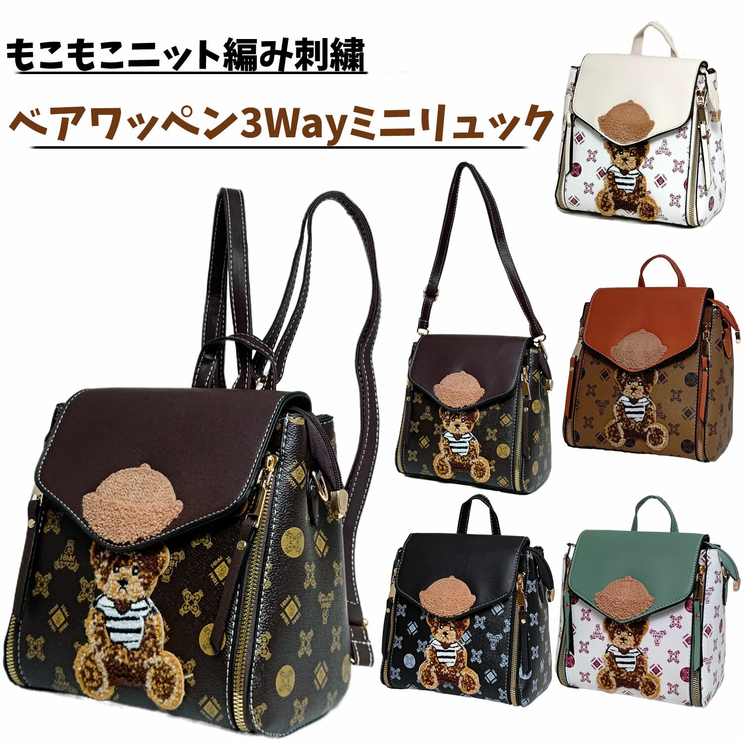 もこもこニット編みのベアーワッペン3Wayミニリュック レディース バッグ バック ハンドバッグ 斜め掛け 肩掛け バックパックお散歩バッグ ショルダー 斜めかけ プレゼント クマ くま 熊 ファンシー ボックスバック 原宿系