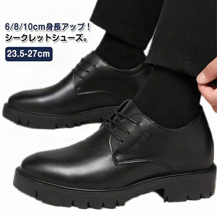 6/8/10cm身長アップ!シークレットシューズ。カジュアルにもフォーマルにも活躍する革靴。コーディネートしやすいシンプルなデザインのシューズです。自然なデザインで外見からはシークレットシューズとは気づかれません。外見からは気づかれず身長を伸ばす、ファッション感は満々です。ビジネスシーンだけでなく、通勤や通学、普段履きとしてもカジュアルなコーデをお楽しみいただけます。豊富なサイズ展開で、就職祝いや父の日などのプレゼントとしてもお勧めです。 サイズ 37(23.5cm) 38(24cm) 39(24.5cm) 40(25cm) 41(25.5cm) 42(26cm) 43(26.5cm) 44(27cm) サイズについての説明 サイズ:37(23.5cm) 38(24cm) 39(24.5cm) 40(25cm) 41(25.5cm) 42(26cm) 43(26.5cm) 44(27cm)※サイズ計測には誤差が生じます。 素材 レザー ゴム 色 6cmアップ 8cmアップ 10cmアップ 備考 ●サイズ詳細等の測り方はスタッフ間で統一、徹底はしておりますが、実寸は商品によって若干の誤差(1cm~3cm )がある場合がございますので、予めご了承ください。 ●製造ロットにより、細部形状の違いや、同色でも色味に多少の誤差が生じます。 ●パッケージは改良のため予告なく仕様を変更する場合があります。 ▼商品の色は、撮影時の光や、お客様のモニターの色具合などにより、実際の商品と異なる場合がございます。あらかじめ、ご了承ください。 ▼生地の特性上、やや匂いが強く感じられるものもございます。数日のご使用や陰干しなどで気になる匂いはほとんど感じられなくなります。 ▼同じ商品でも生産時期により形やサイズ、カラーに多少の誤差が生じる場合もございます。 ▼他店舗でも在庫を共有して販売をしている為、受注後欠品となる場合もございます。予め、ご了承お願い申し上げます。 ▼出荷前に全て検品を行っておりますが、万が一商品に不具合があった場合は、お問い合わせフォームまたはメールよりご連絡頂けます様お願い申し上げます。速やかに対応致しますのでご安心ください。
