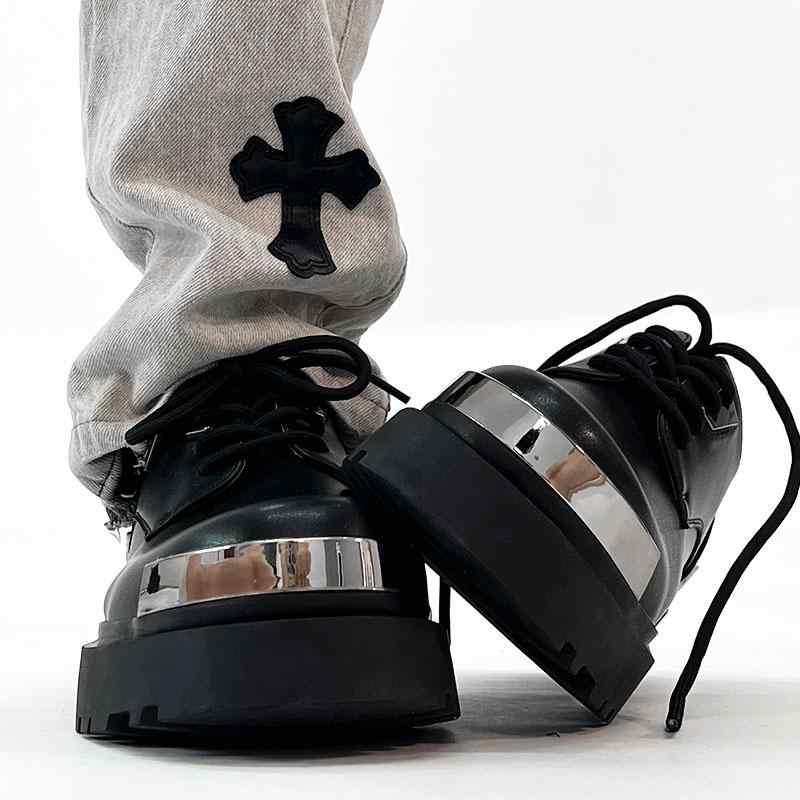 メンズ ハイエンド 黒 革 ダービーシューズ 英国 厚底 革靴 ストリート カップル 大きいつま先 ミディアムヒール ラウンドトゥ レザー