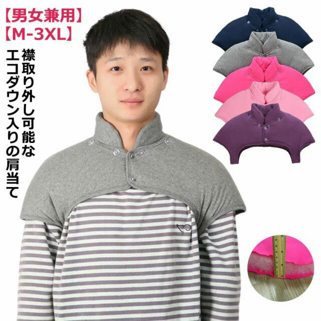 襟取り外し可能なエコダウン入りの肩当て。【男女兼用】【M-3XL】睡眠時に着用いただくと、首肩まわりからの冷えを防止でき、暖かく安眠、快眠いただけます。睡眠時以外にも、軽くてあったか、肩の凝らない、はおりもの 防寒着として室内で気軽に羽織れる便利グッズです。前開きデザインで着脱が簡単!サッと手軽に羽織れます。お袖がないので、軽くて気軽にお部屋着にプラスでき、肩の凝らないデザインです。上質なコットン素材を使用していますので、ガサガサ音が気にならず、ご就寝時の肩口の冷え対策に定評のある優れもの。秋から春まで長い期間お使い頂けます。 サイズM L XL 2XL 3XLサイズについての説明【M】肩幅35-37cm バスト72-82cm【L】肩幅37-41cm バスト75-92cm【XL】肩幅41-45cm バスト92-102cm【2XL】肩幅45-50cm バスト102-112cm【3XL】肩幅50-54cm バスト112-122cm素材ポリエステル、綿色ピンク グレー ライトピンク パープル ブラック備考サイズ詳細等の測り方はスタッフ間で統一、徹底はしておりますが、実寸は商品によって若干の誤差(1cm〜3cm )がある場合がございますので、予めご了承ください。商品の色は、撮影時の光や、お客様のモニターの色具合などにより、実際の商品と異なる場合がございます。あらかじめ、ご了承ください。▼色味の強い製品によっては他の衣類などに色移りする場合もございますので、速やかに(脱水、乾燥等)するようにお願いいたします。▼▼生地の特性上、やや匂いが強く感じられるものもございます。数日のご使用や陰干しなどで気になる匂いはほとんど感じられなくなります。エコダウン 肩当て 寝具 襟取り外し可 インナー 下着 ナイトウエア 豊富な品揃え ピンク グレー ライトピンク パープル ブラック M L XL 2XL 3XL