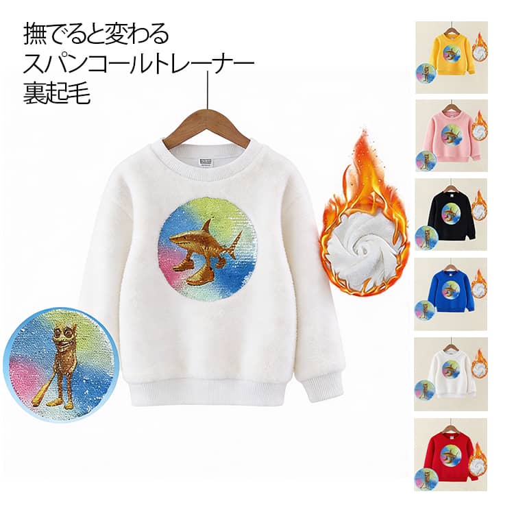 スパンコールを撫でるだけで、絵柄がチェンジ!遊び心たっぷりで、着るたび楽しいキラキラ輝くイタリアンブレインロットデザインのあったか裏起毛スウェットトレーナー。スパンコールを上下に撫でると、トゥントゥントゥンサフール ⇔ トララレロトラララ デザインが変化し、キラキラ輝いて存在感抜群。ふんわり暖かい裏起毛仕様、秋冬のお出かけ、プレゼントなどにピッタリな1枚。 サイズ 100 110 120 130 140 150 サイズについての説明 100 着丈42 バスト69 肩幅30 袖丈36110 着丈45 バスト73 肩幅31.5 袖丈38120 着丈48 バスト77 肩幅33 袖丈40130 着丈51 バスト81 肩幅34.5 袖丈42140 着丈54 バスト85 肩幅36 袖丈44150 着丈56 バスト89 肩幅37.5 袖丈46※サイズ表の実寸法は商品によって1-3cm程度の誤差がある場合がございます。 素材 表地:コットン裏側:ポリエステル 色 ホワイト(裏起毛) ピンク(裏起毛) ブルー(裏起毛) レッド(裏起毛) イエロー(裏起毛) ブラック(裏起毛) 備考 ●サイズ詳細等の測り方はスタッフ間で統一、徹底はしておりますが、実寸は商品によって若干の誤差(1cm〜3cm )がある場合がございますので、予めご了承ください。 ●商品の色は、撮影時の光や、お客様のモニターの色具合などにより、実際の商品と異なる場合がございます。あらかじめ、ご了承ください。 ●製品によっては、生地の特性上、洗濯時に縮む場合がございますので洗濯時はご注意下さいませ。 ▼色味の強い製品によっては他の衣類などに色移りする場合もございますので、速やかに(脱水、乾燥等)するようにお願いいたします。 ▼生地によっては摩擦や汗、雨などで濡れた時は、他の製品に移染する恐れがございますので、着用の際はご注意下さい。 ▼生地の特性上、やや匂いが強く感じられるものもございます。数日のご使用や陰干しなどで気になる匂いはほとんど感じられなくなります。