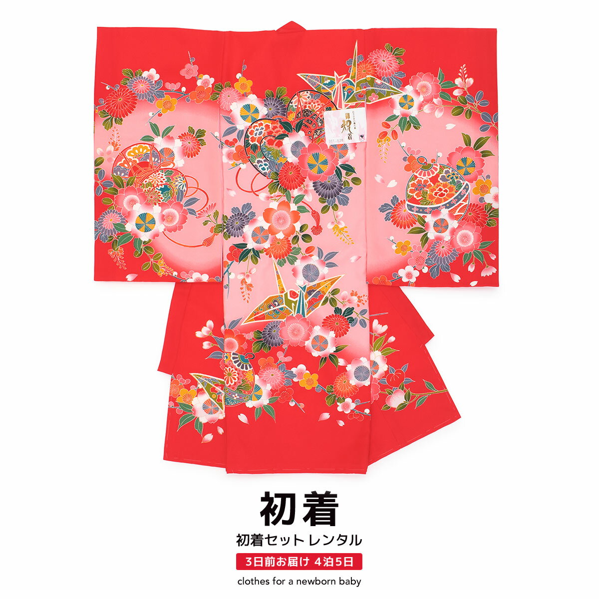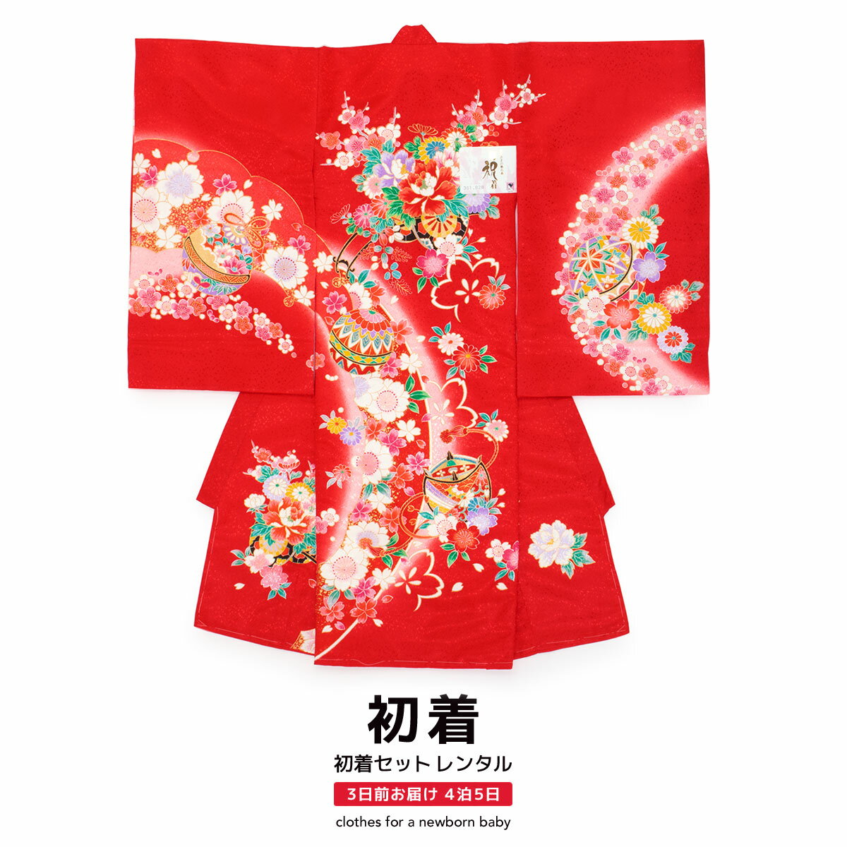 【スーパーSALE限定☆最大3000円クーポン配布中☆】【レンタル】 お宮参り 女の子 レンタル 産着 フルセット 赤 レッド 桜 菊 梅 鼓 折り鶴 女児 掛け着 うぶぎ 祝着 記念撮影 赤ちゃん 祝い着 帽子 よだれかけ 創美苑 往復送料無料