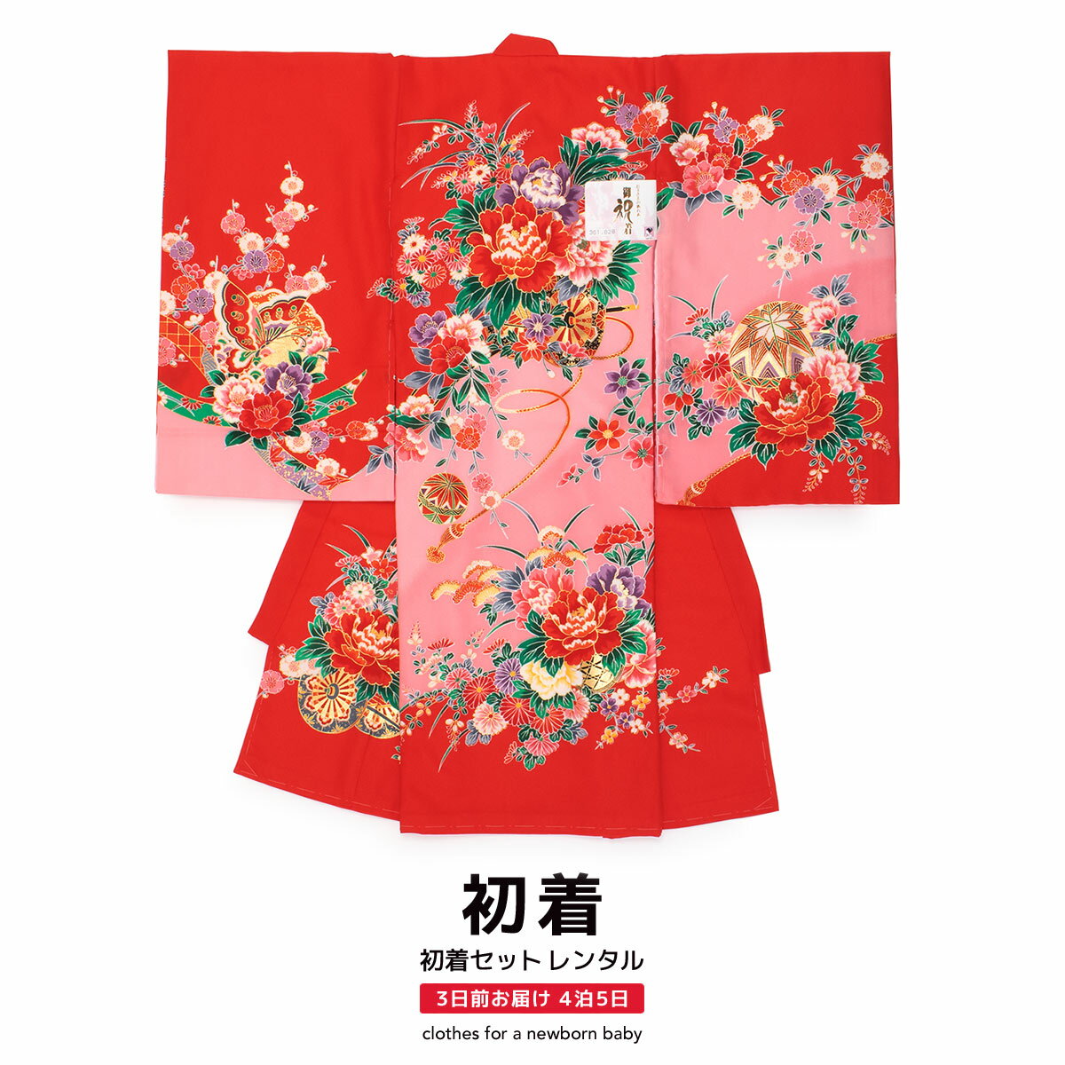 【スーパーSALE限定☆最大3000円クーポン配布中☆】【レンタル】 お宮参り 女の子 レンタル 産着 フルセット 赤 レッド 牡丹 梅 菊 梅 桜 手鞠 女児 掛け着 うぶぎ 祝着 記念撮影 赤ちゃん 祝い着 帽子 よだれかけ 創美苑 往復送料無料