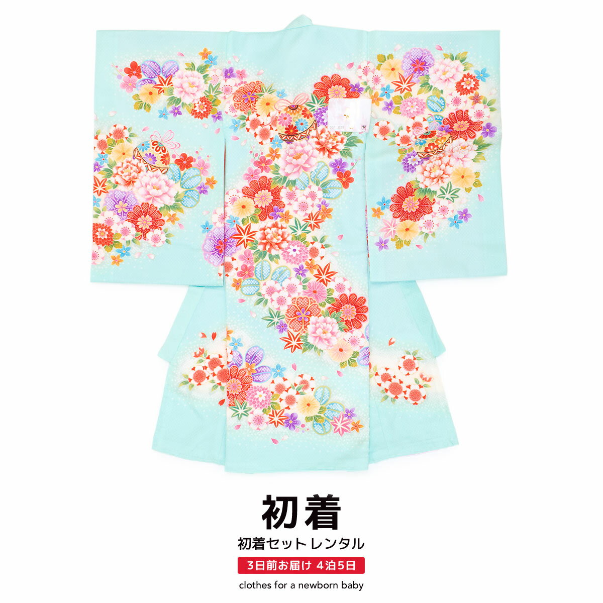 【スーパーSALE限定☆最大3000円クーポン配布中☆】【レンタル】 お宮参り 女の子 レンタル 産着 フルセット 水色 ライトブルー 牡丹 桜 菊 鈴 女児 掛け着 うぶぎ 祝着 記念撮影 赤ちゃん 祝い着 帽子 よだれかけ 創美苑 往復送料無料