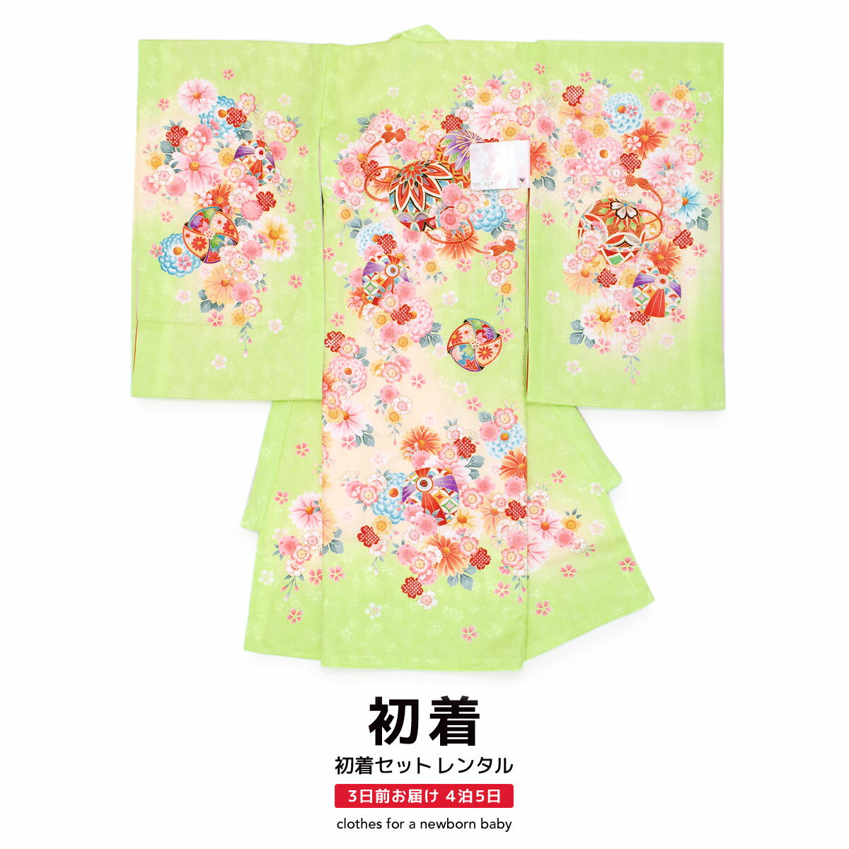 【スーパーSALE限定☆最大3000円クーポン配布中☆】【レンタル】 お宮参り 女の子 レンタル 産着 フルセット 黄緑色 イエローグリーン 桜 さくら 菊 キク 花 手鞠 女児 掛け着 うぶぎ 祝着 記念撮影 赤ちゃん 祝い着 帽子 よだれかけ 創美苑 往復送料無料