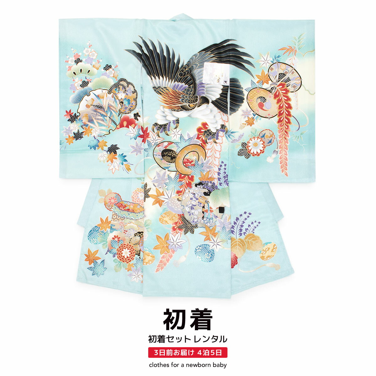 【スーパーSALE限定☆最大3000円クーポン配布中☆】【レンタル】 お宮参り 男の子 レンタル 産着 フルセット 水色 ライトブルー 鷹 藤 楓 雪輪 萩 松 菊 貝桶 男児 掛け着 うぶぎ 祝着 記念撮影 赤ちゃん 祝い着 帽子 よだれかけ 創美苑 往復送料無料