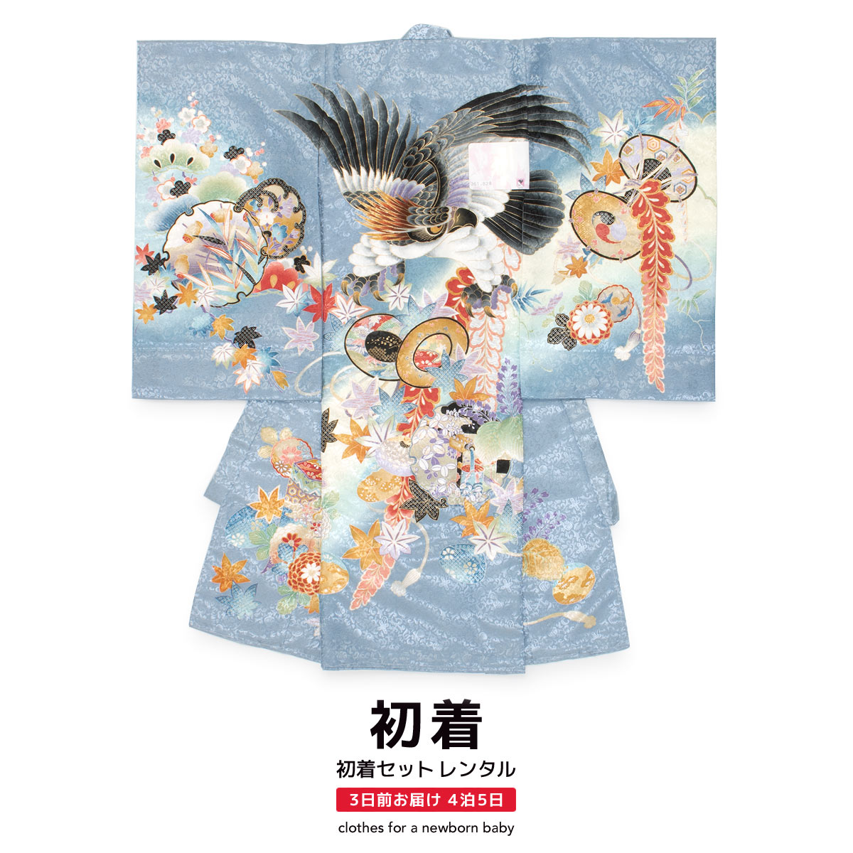 【スーパーSALE限定☆最大3000円クーポン配布中☆】【レンタル】 お宮参り 男の子 レンタル 産着 フルセット 灰青色 ブルーグレー 鷹 藤 楓 雪輪 萩 松 菊 貝桶 男児 掛け着 うぶぎ 祝着 記念撮影 赤ちゃん 祝い着 帽子 よだれかけ 創美苑 往復送料無料