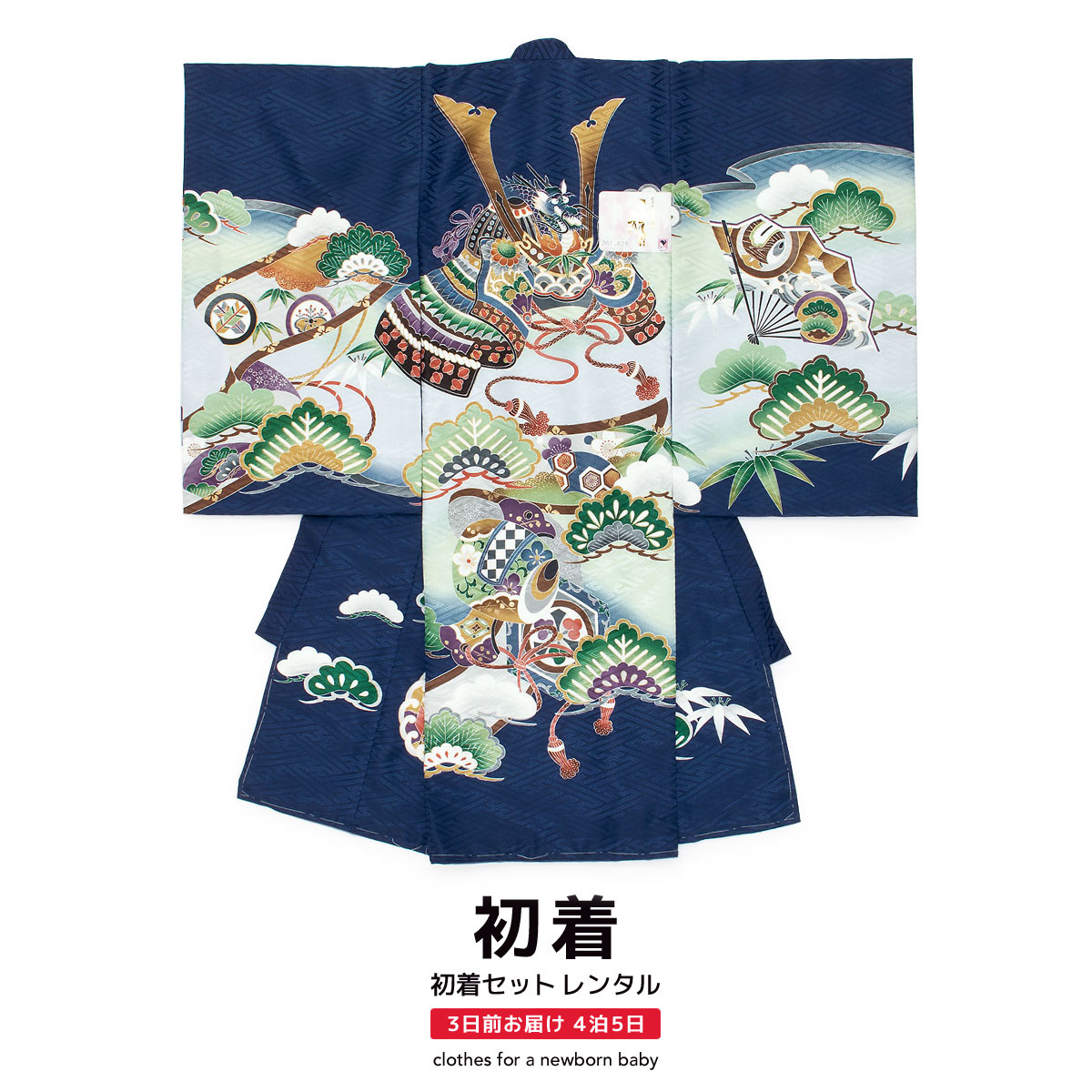 【スーパーSALE限定☆最大3000円クーポン配布中☆】【レンタル】 お宮参り 男の子 レンタル 産着 フルセット 藍 ネイビー 竜頭兜 扇子 熨斗 小槌 松 男児 掛け着 うぶぎ 祝着 記念撮影 赤ちゃん 祝い着 帽子 よだれかけ 創美苑 往復送料無料