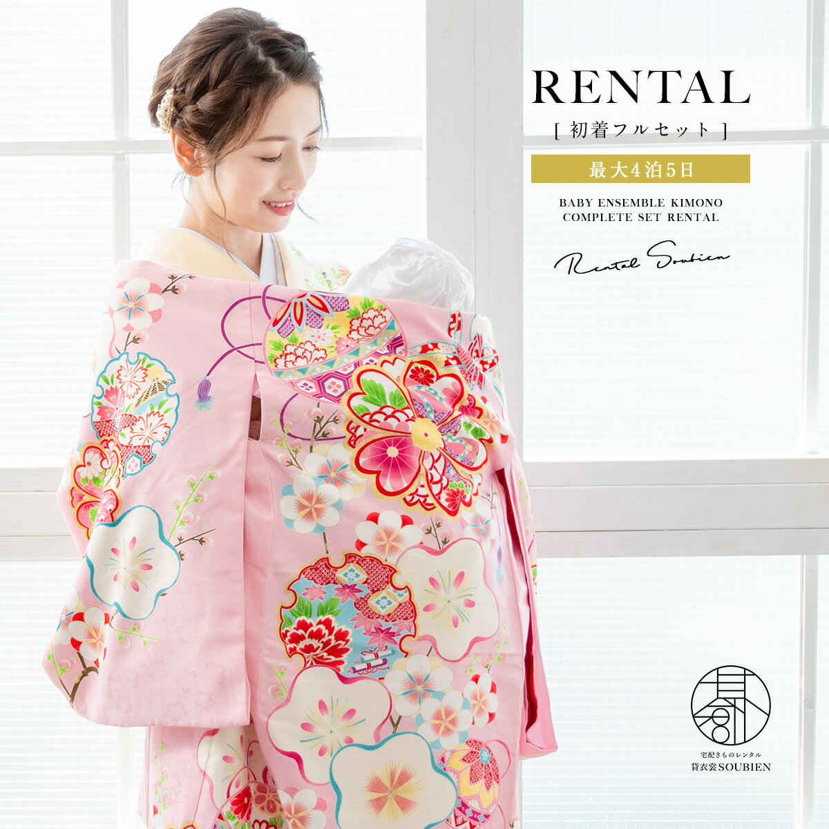 【スーパーSALE限定☆最大3000円クーポン配布中☆】【レンタル】 お宮参り 女の子 レンタル 産着 フルセット ピンク 白 牡丹 梅 桜 菊 花束 雪輪 折り鶴 リボン 女児 掛け着 うぶぎ 祝着 記念撮影 赤ちゃん 祝い着 帽子 よだれかけ 創美苑 往復送料無料